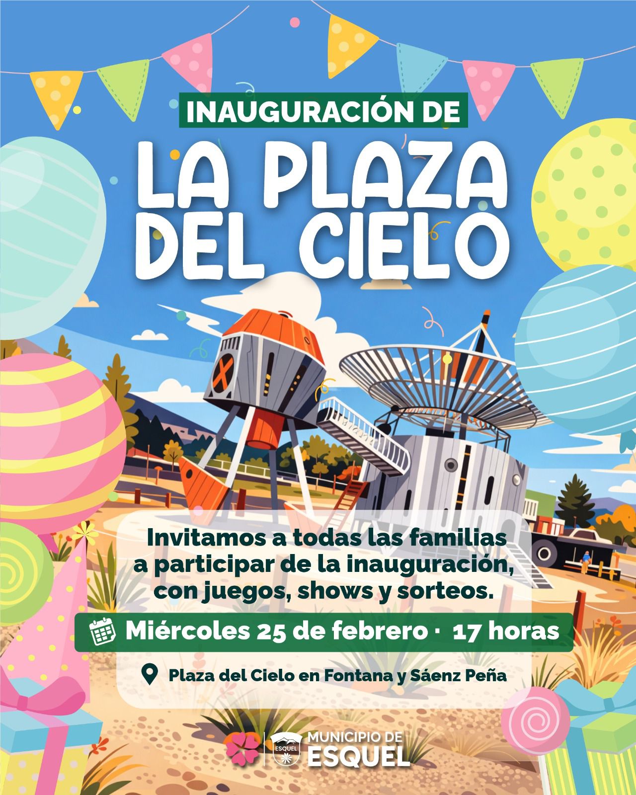 Este miércoles 25 de febrero a las 17 horas te esperamos para vivir juntos la inauguración de la Plaza del Cielo, un espacio pensado para el encuentro, el juego y la alegría de todas las familias. 💛
