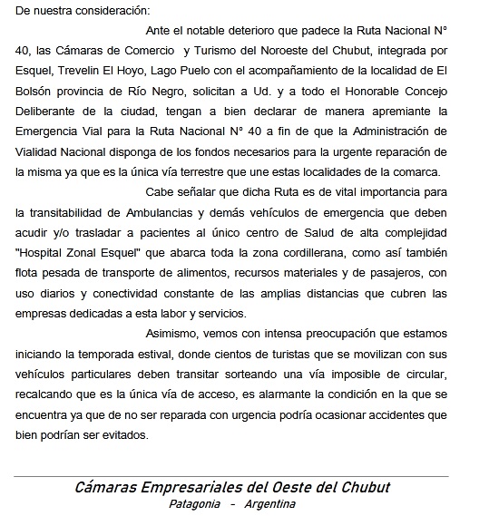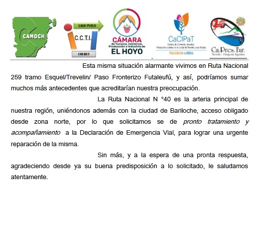 Alumine Honik integrante de distintas cámaras de turismo de Rio Negro y Chubut y han manifestado a las autoridades de Rio Negro y Chubut que declaren la emergencia vial en la ruta nacional n°40 que está en pésimo estado, en contacto con FM DEL LAGO, Honik pidió que se actué rápidamente, “es claro que las autoridades tienen que reclamarle a las autoridades nacionales, el tramo Bariloche- Bolsón no permiten circular los autos en alquiler, esto nos está perjudicando, el tramo de la ruta Bolsón-Bariloche está destruida, las agencias de alquileres de autos le prohíben circular de Bariloche a Bolsón y al sur para evitar que se rompan los vehículos”, manifestó la vicepresidenta de la cámara de turismo de El Hoyo.