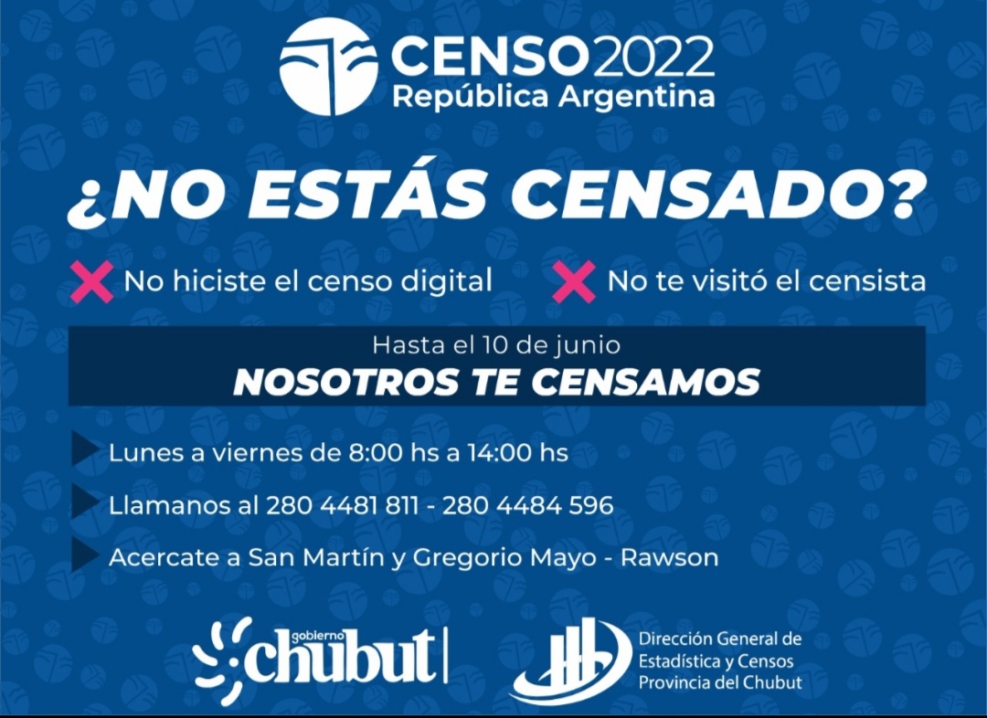 El Gobierno del Chubut convoca a la población que no fue censada durante el Operativo Nacional del ‘Censo 2022’, que se desarrolló el pasado 18 de mayo, a poder realizar el trámite y de esa forma poder completar los datos de cada hogar de la Provincia.