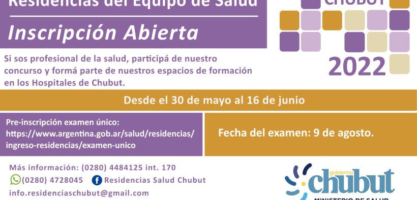 El Gobierno del Chubut, convoca a médicos/as y otros profesionales de la salud de todo el país, a participar del concurso para cubrir los 92 cargos disponibles en las “Residencias del Equipo de Salud de Chubut 2022”, cuyas inscripciones abrieron este lunes 30 de mayo y se extenderán hasta el jueves 16 de junio próximo.