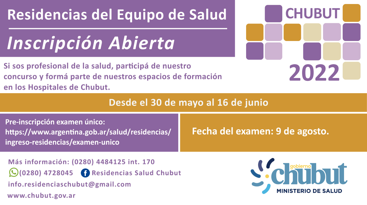 El Gobierno del Chubut, convoca a médicos/as y otros profesionales de la salud de todo el país, a participar del concurso para cubrir los 92 cargos disponibles en las “Residencias del Equipo de Salud de Chubut 2022”, cuyas inscripciones abrieron este lunes 30 de mayo y se extenderán hasta el jueves 16 de junio próximo.