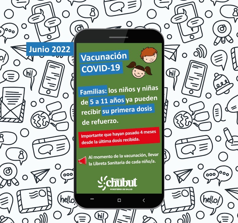 El Gobierno del Chubut, a través del Ministerio de Salud provincial, que conduce Fabián Puratich, informó que ya se encuentra disponible en todos los vacunatorios de la provincia la primera dosis de refuerzo de la vacuna contra Covid-19 para los niños y las niñas de 5 a 11 años de edad, que ya hayan completado su esquema de vacunación inicial hace por lo menos 120 días.