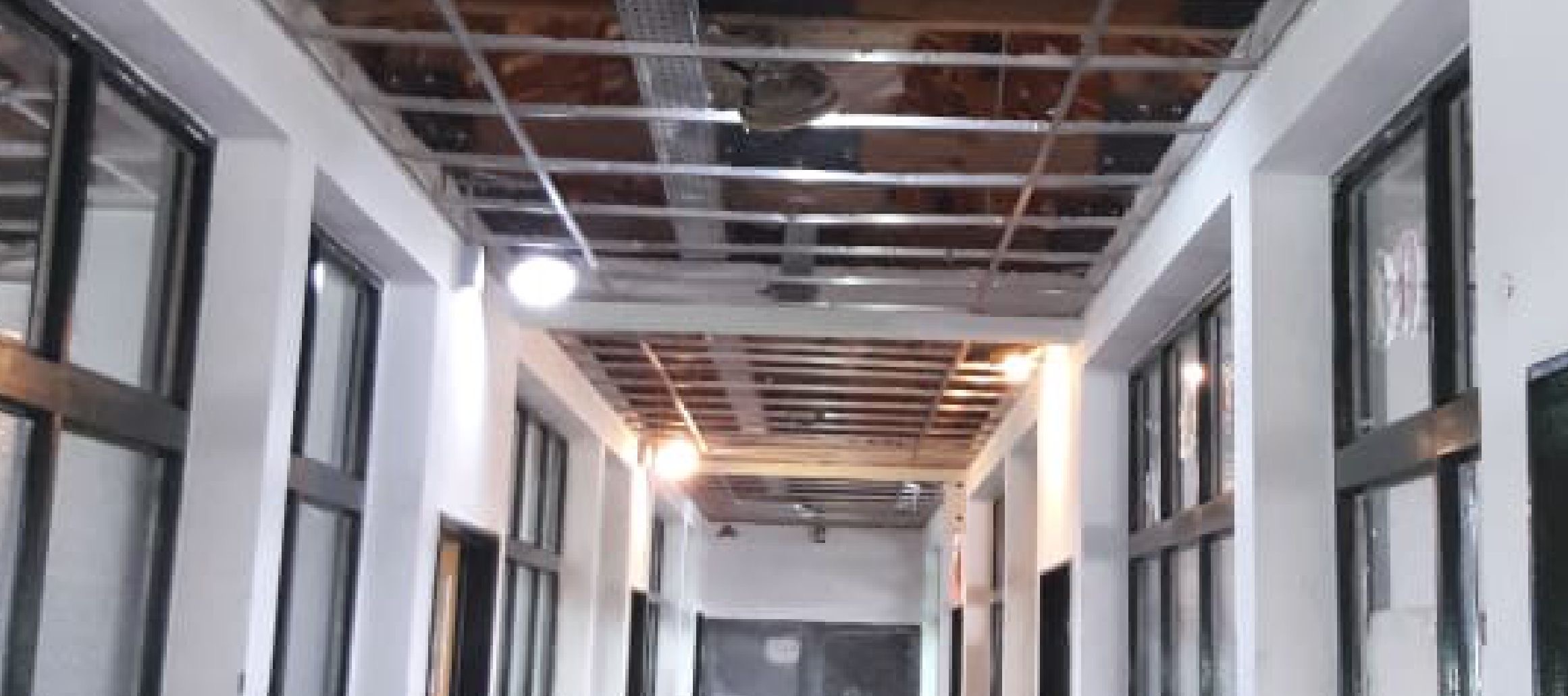 Con respecto al cielorraso, se constató en el sector dos del edificio escolar el deterioro que presenta el mismo, además del faltante de algunas de las placas. Por este motivo, se trabaja en el retiro y recambio total de la cubierta, reemplazando 280,00 metros cuadrados de superficie.
