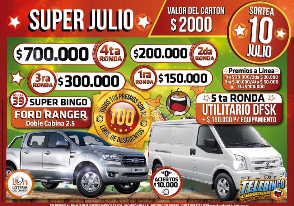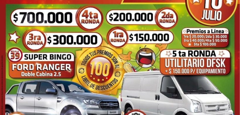 El cartón tiene un costo de 2 mil pesos y la premiación contará con las tradicionales cinco rondas en las que se sorteará $150.000 en la primera, $200.000 en la segunda, $300.000 en la tercera, $700.000 en la cuarta y un Utilitario DFSK más $150.000 para equipamiento en la quinta ronda. También habrá Premios a Línea que irán desde los $10.000 a los $100.000 pesos y a Súper Bingo una Ford Ranger Doble Cabina 2.5.