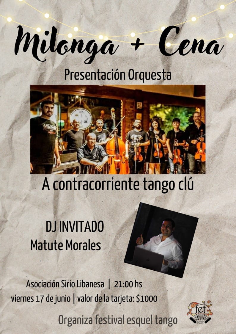 El viernes 17 de junio acercate a la Asociación Sirio Libanesa para disfrutar de la Milonga Cena con la presentación de la Orquesta “A Contracorriente Tango Clú” y toda la música de Dj Matute Morales.