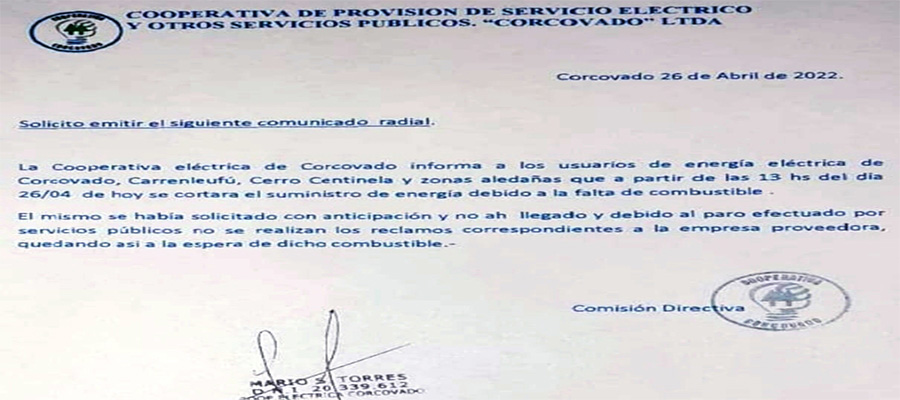 Otra vez la comunidad de Corcovado, Carrenleufú y Cerro Centinela quedaran sin energía eléctrica por falta de combustible para los motores que abastecen del servicio eléctrico a estas comunidades, el combustible no llegó por el paro de los trabajadores de servicios públicos que no realizan el reclamo a la empresa proveedora, en comunicación con FM DEL LAGO, el Presidente de la Cooperativa de Corcovado Mario Torres manifestó  “estamos sin combustible, hace una semana atrás se mandó el pedido de combustible a la empresa que distribuye, por el momento están sufriendo un paro en servicio públicos, que vengan los camiones  a la usina es imposible por el paro de 45 hs, a raíz del corte de luz que se ha generado hemos quedado sin combustible, se va a mandar un camioncito a Tecka para traer combustible y poder distribuir”