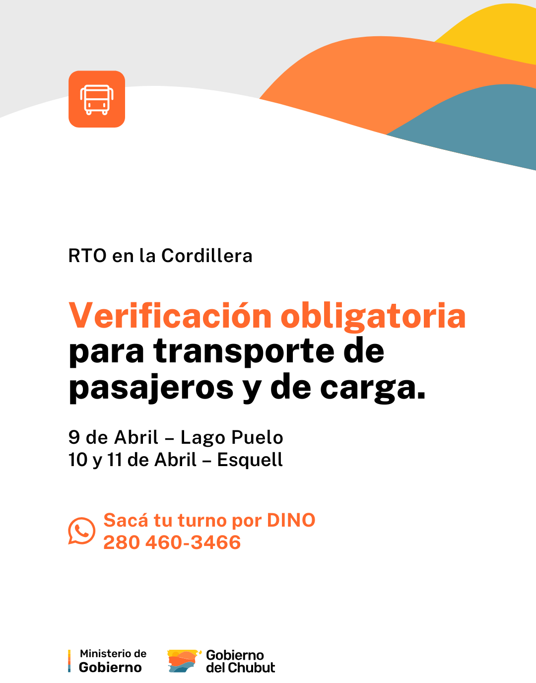 El Gobierno del Chubut, a través de la Subsecretaría de Autotransporte Terrestre, informa que durante el mes de abril se realizarán jornadas de Revisión Técnica Obligatoria (RTO) en la zona cordillerana, destinadas a vehículos de transporte de carga y de pasajeros.