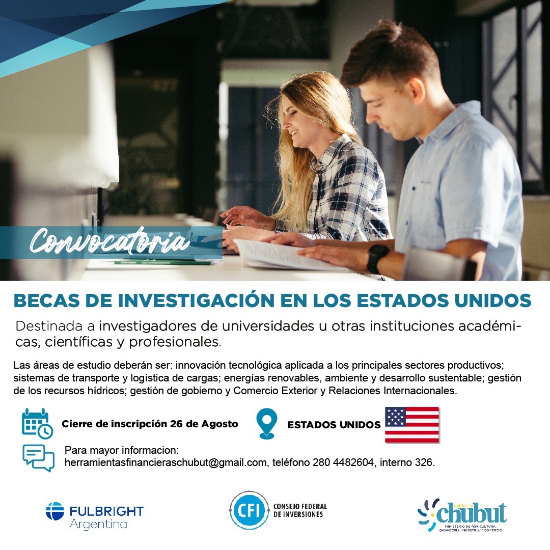 El Gobierno del Chubut, a través del Ministerio de Agricultura, Ganadería, Industria y Comercio, informa que se encuentra abierta hasta el 26 de agosto la postulación para participar de la convocatoria para las becas de investigación en diversas universidades de Estados Unidos.
