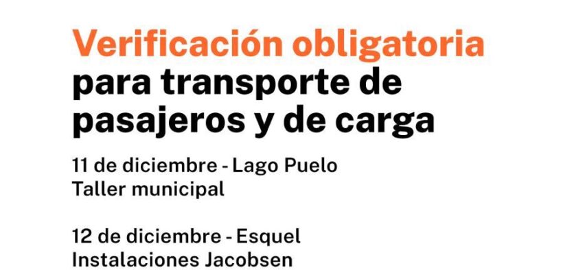 El Ministerio de Gobierno del Chubut, a través de la Subsecretaría de Autotransporte Terrestre, informa que los días jueves 11 de diciembre en Lago Puelo, en el Taller Municipal, y viernes 12 de diciembre en la ciudad de Esquel, en las instalaciones de la empresa Jacobsen, se llevarán a cabo jornadas de Verificación Técnica Vehicular (VTV) obligatoria para el transporte de pasajeros y de carga.